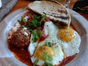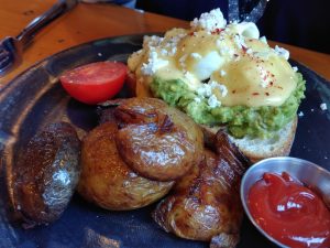 Our foods comes to us before we even realize, they look quite attractive and delicious. Mine comes with 2 meat balls, tortilla and 2 eggs, it serves with feta cheese and a tomato based marinara sauce. Wife’s benny is… a avocado toast on a sourdough, with roasted potatoes and tomato. There is nothing wrong with the food, it’s just… not memorable. It’s delicious but not spectacular (compare to Fable), I wish my dish could come with some pasta, I am sure it goes well with the sauce and meat balls. Wife says the poach eggs are done excellent, the cold avocado and the thick sourdough bread is where the dish fails. The poach eggs on top of the cold avocado on top of the warm bread just make the benny at about room temperature, the bread simply becomes harden to a point where it’s not edible. Our side order of sourdough bread is good when it’s hot, once it is cooling down it is quite hard. We have to forget about the last piece because it’s just hard as rock.